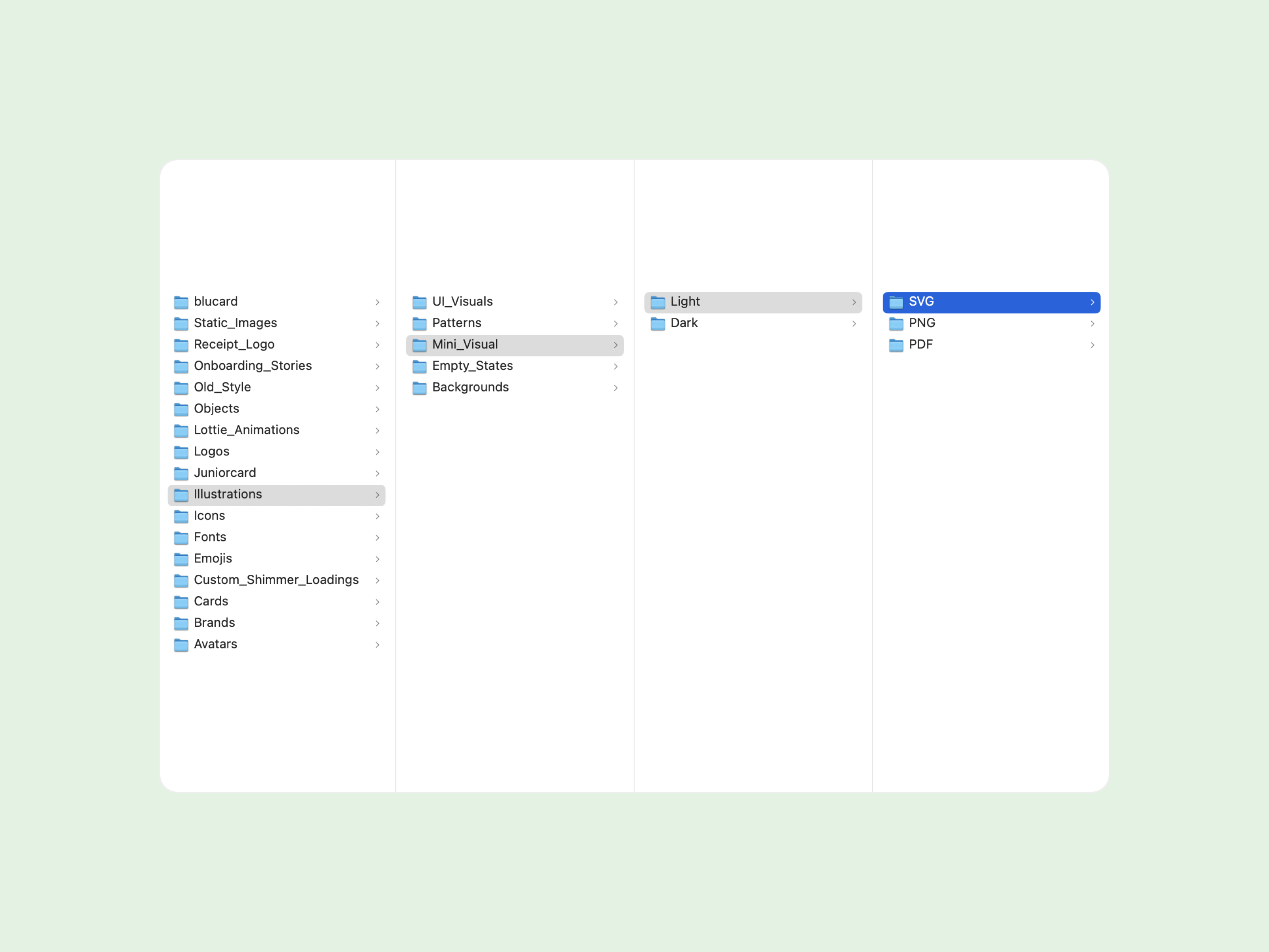 در مورد فرمت‌های خروجی هم خوب است که با توسعه‌دهندگان مشورت کنید که برای هر دسته از چه خروجی‌هایی قرار است استفاده کنند تا برای آن‌ها هم فولدرهایی داخل دسته‌بندی‌ها تشکیل دهید. حتی برای تم‌هایی مثل دارک و لایت هم فولدرهای جداگانه تشکیل دهید. این فولدرها می‌توانند قبل از فرمت فایل قرار بگیرند. در نهایت قرار است از این فولدرها به چشم سوییچ نگاه کنیم و فایل‌های خروجی در همه این فولدرها نام‌های یکسانی داشته باشند و بتوان به راحتی بینشان سوییچ کرد.
