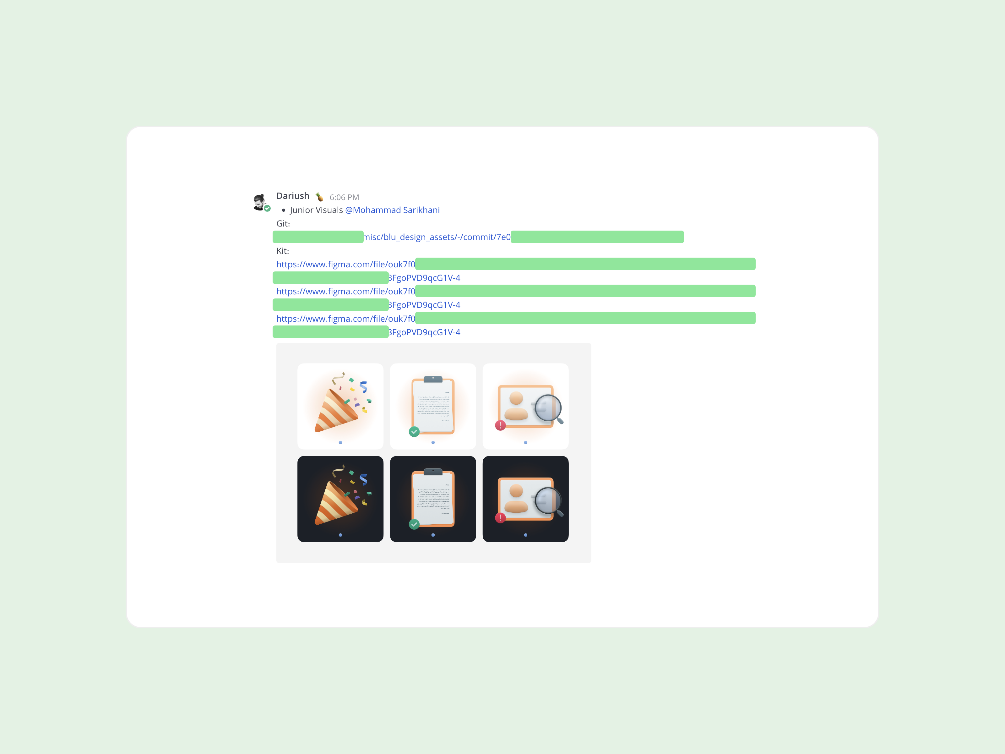 حالا وقت اطلاع‌رسانی است. ما یک کانال برای آپدیت‌های دیزاین سیستم و ویژوال‌هایمان داریم که همه طراحان و بچه‌های توسعه در آن عضو هستند. می‌آییم و در یک پیام جدا، چیزی که اضافه شده، لینک کامیت و لینک آن در دیزاین سیستم را می‌گذاریم و کسانی که باید از این پیام حتماً مطلع شوند را منشن می‌کنیم. سعی می‌کنیم یک تصویر از موارد اضافه شده یا تغییر داده شده ضمیمه پیام کنیم. یک کپی از همین متن را تسک مرتبطش کامنت می‌کنیم و تسک را برای ریویو می‌فرستیم.