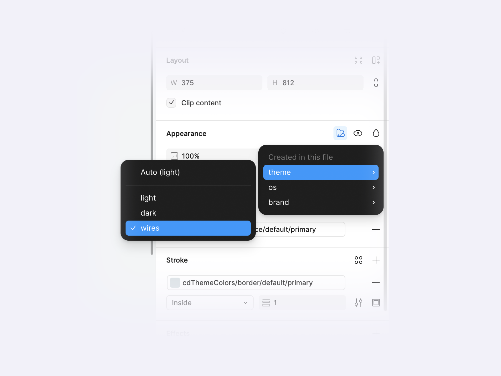 بعد از نصب فونت، کامپوننت، فریم و یا صفحه مورد نظر خود را انتخاب کنید و سپس مقدار پراپرتی theme را بر روی wires قرار دهید. موارد انتخاب شده به صورت خودکار به حالتی شبیه وایرفریم تبدیل میشوند. از این حالت میتوانید برای طرح‌ها و اسکچ‌های اولیه استفاده کنید. در این کالت کامپوننت‌ها و متن‌ها مانند حالت‌های light و dark عمل میکنند و فقط نحوه نمایش آنها متفاوت است. بعد از نهایی کردن تغییرات، میتوانید مقدار theme را بر روی حالت‌های دیگر مثل light یا dark قرار دهید.